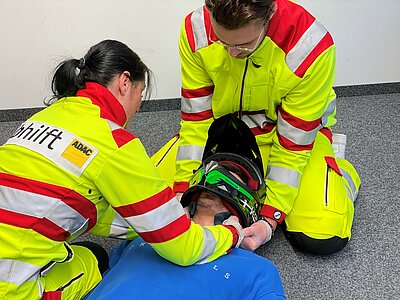 Es ist ratsam, beim Entfernen des Helms zu zweit vorzugehen. Der zweite Helfer sollte seitlich neben dem verletzten Motorradfahrer knien und mit beiden Händen am Unterkiefer entlang folgen, während der erste Helfer den Helm behutsam nach oben zieht. Sobald der Helm abgenommen ist, legen Sie den Kopf des Verunfallten sanft ab. Einer der Helfer sollte dann den Notruf absetzen, während der andere die Atmung des Betroffenen überprüft. Dazu überstrecken Sie leicht den Hals des Verletzten und legen das Ohr dicht über Nase und Mund, während Sie gleichzeitig darauf achten, ob der Brustkorb sich hebt und senkt, ob Sie Atemgeräusche hören und ob Sie einen Luftzug von der Atmung auf der Wange spüren. Wenn ja, bringen Sie den Verletzten in die Seitenlage, wenn nicht, beginnen Sie mit Wiederbelebungsmaßnahmen.